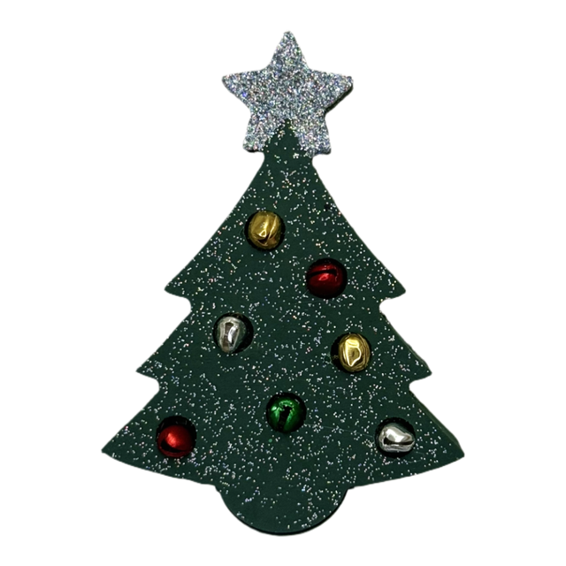 Details: Green glitter tree with tiny jingle bells and a silver glitter star